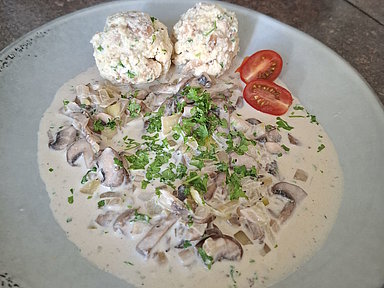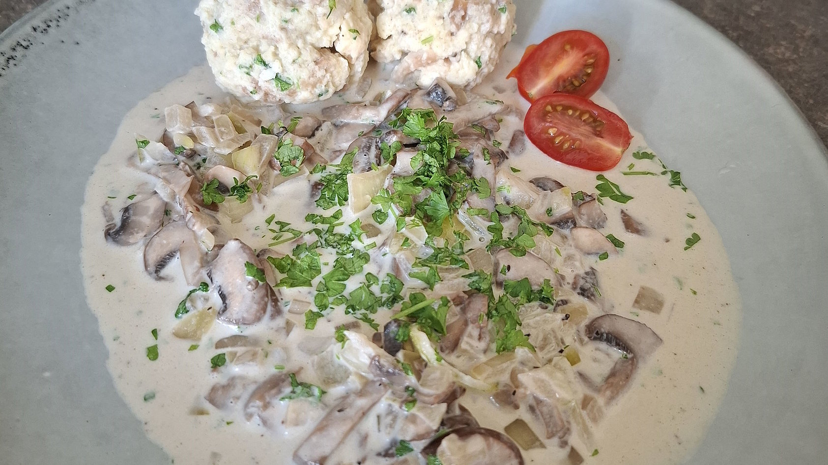 Alle restlichen Knödel in kochendes Salzwassergeben und bei mittlerer Hitze ca. 10-15 Minuten garziehen.Für das Gericht zwei Knödel mit der Champignonrahmsoße anrichten. Fertig.