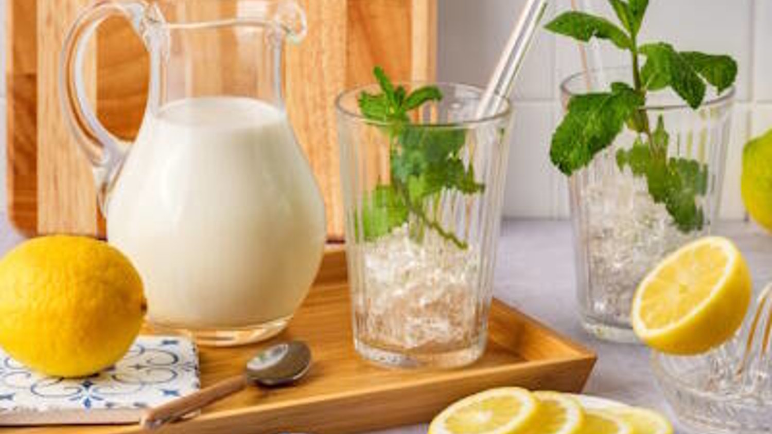 - Nach Bedarf Eiswürfel in eine Karaffe oder einen Limonadenspender geben, nach Belieben Zitronenscheiben und ein paar Stängel der Minze hinzugeben und die angerührte Limonade darauf gießen.