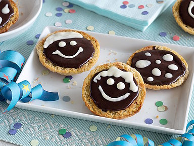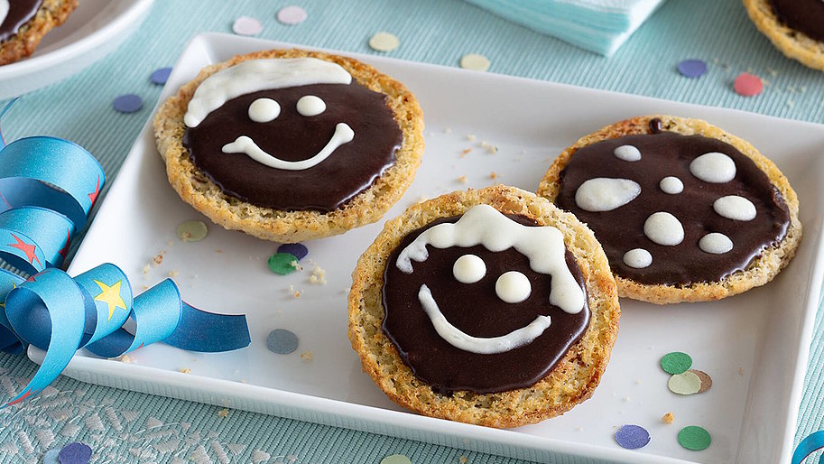 - Wenn die Schokoglasur trocken ist, mit der hellen Glasur beliebige Motive darauf spritzen.