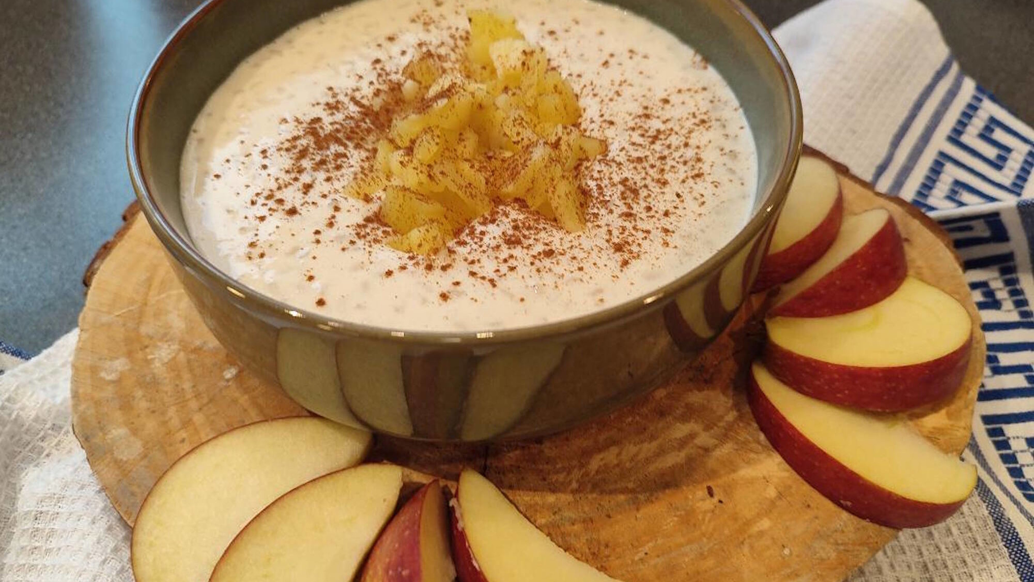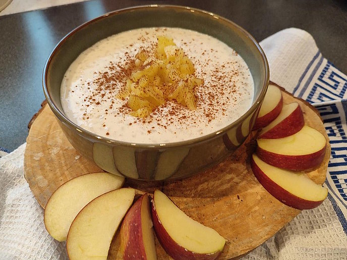 - Mit dem gewürfelten Apfel toppen und mit etwas Zimt bestreuen.
