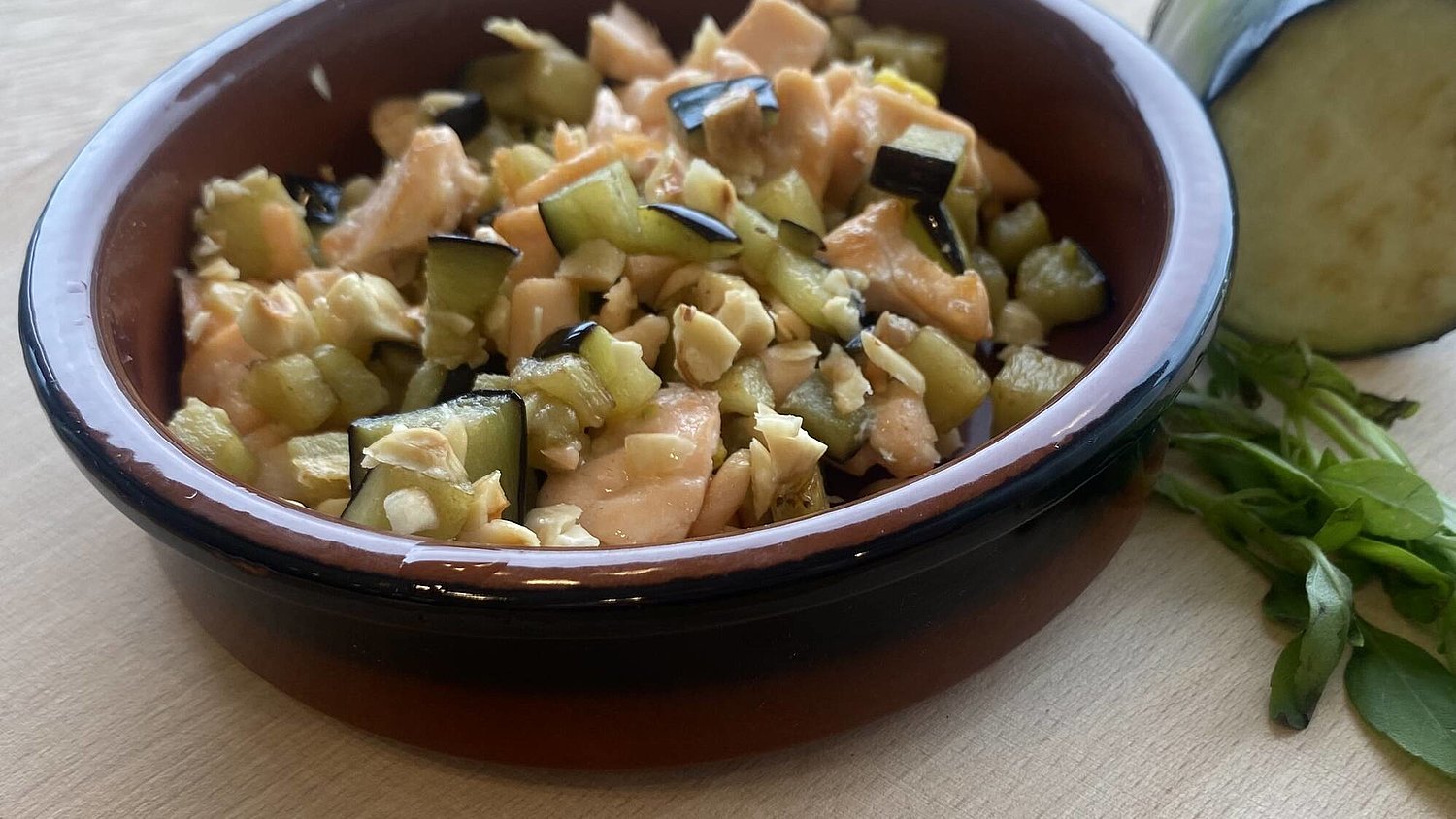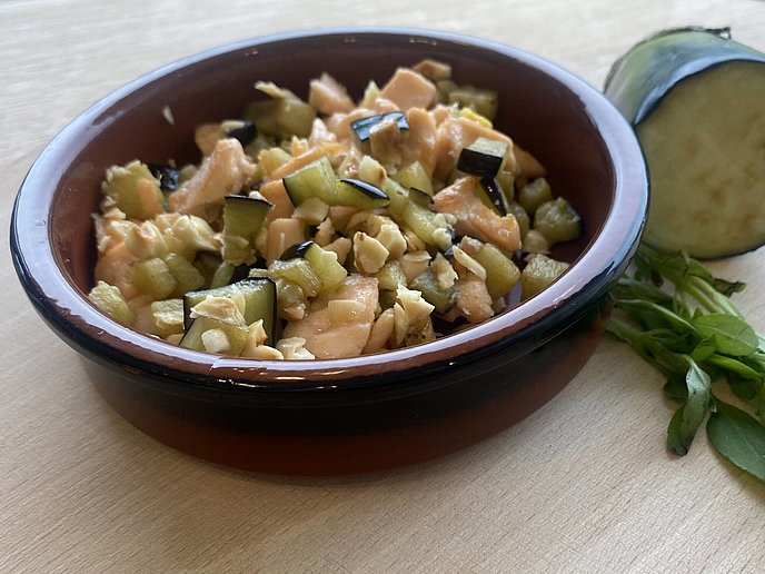 Auberginen- und Lachswürfel mit Haselnusskrümeln
