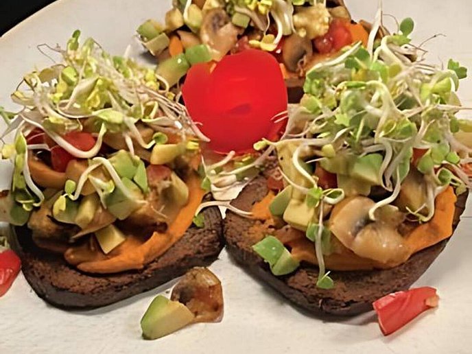 - In einer Schüssel die Pilze mit den Tomaten und der Avocado vermischen, mit Salz würzen, Pfeffer, einem Spritzer Limettensaft und dem MCT Öl 77 % vermischen.