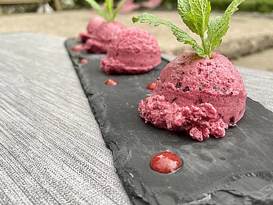 - Mit einem Eisportionierer Kugeln abstechen und servieren.