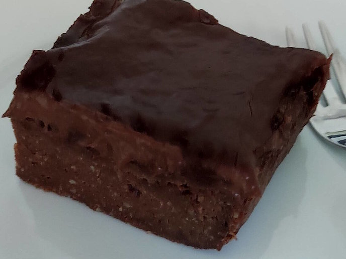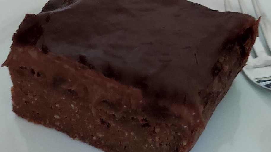 - Vegane Sahne und KetoBiota mit einem Schneebesen verrühren. Die Masse kurz aufkochen lassen und vom Herd ziehen. 60 g MCT Cacao Bar grob hacken, einrühren und eine Minute warten. Zuletzt die Masse gleichmäßig auf den Brownies verteilen und abkühlen lassen.