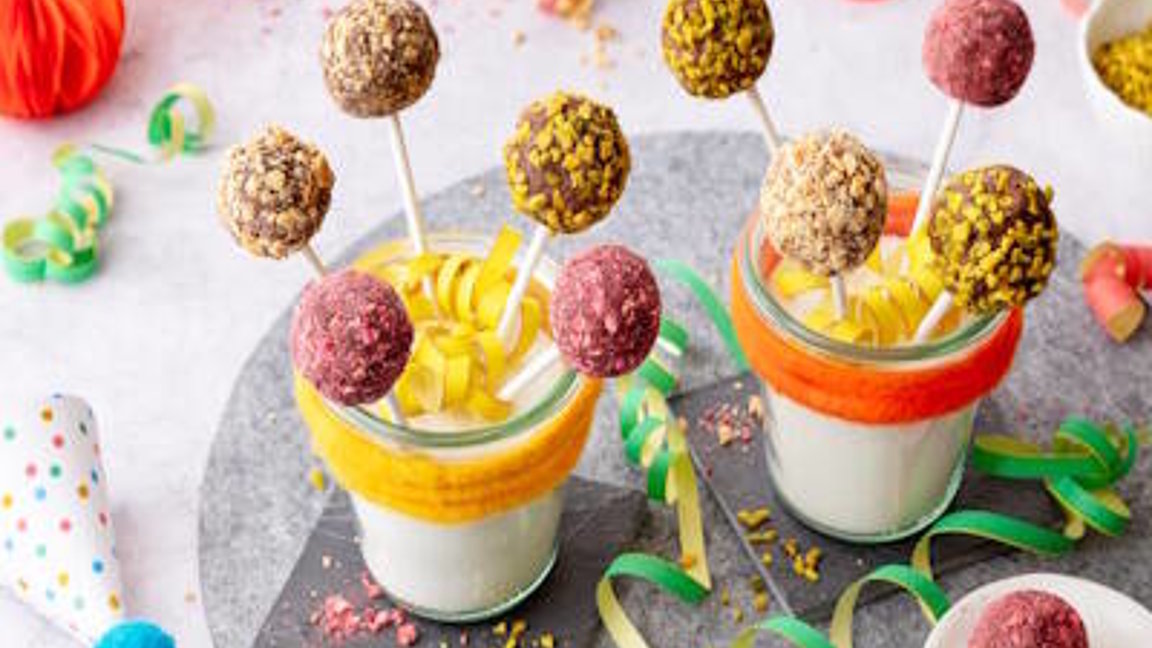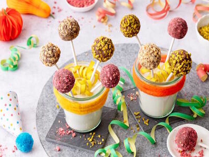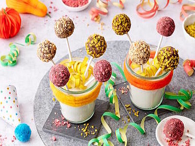- Himbeeren, Erdnüsse und Pitazien hacken. Anschließend je 3 Kugeln in je einem Toppings wälzen, die Verzierungen etwas andrücken. Cake-Pops auf Stäbchen oder Holzspieße stecken und nochmals kühl stellen.
