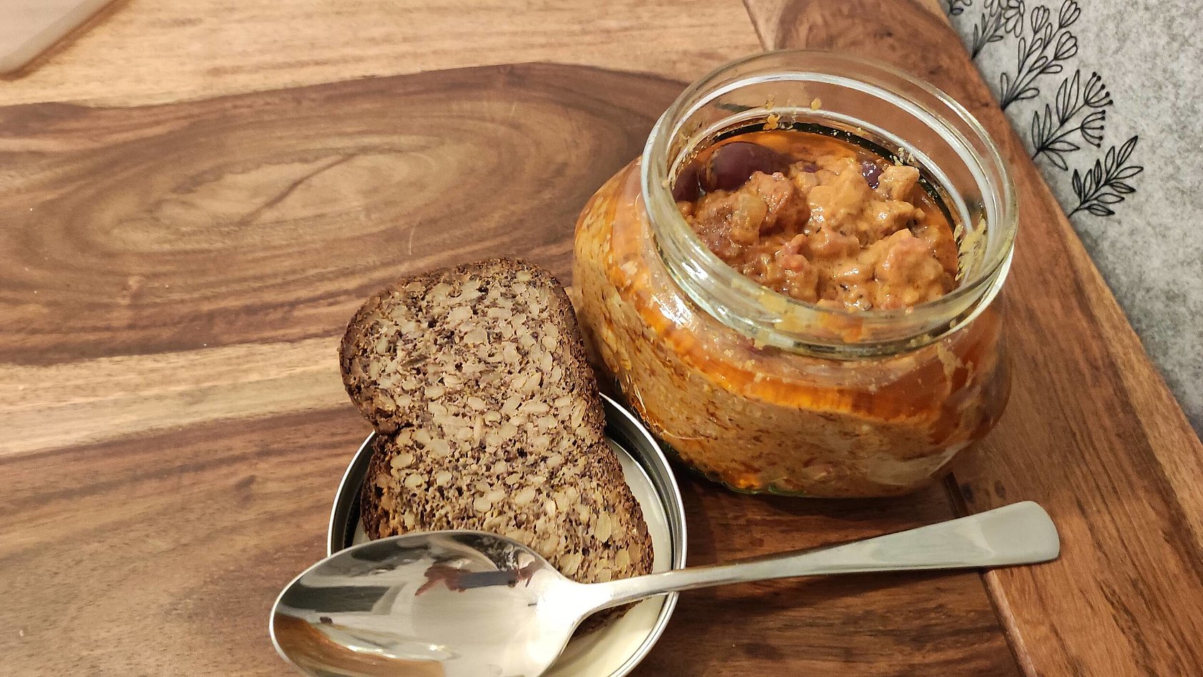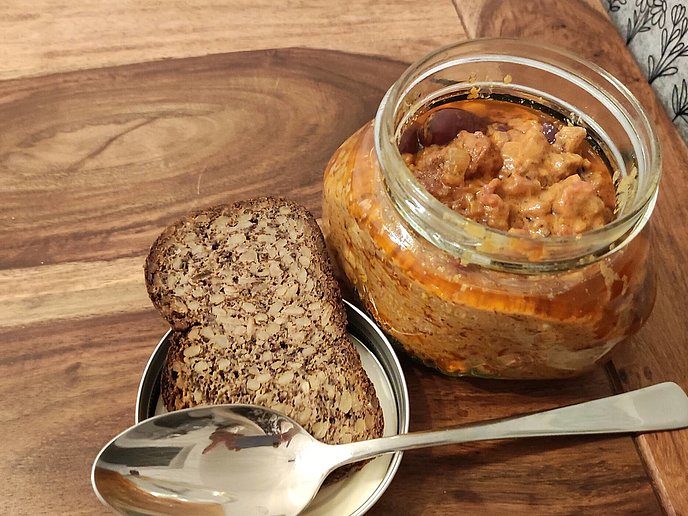 - Das vegane Hackfleisch und die kleingeschnittenen Zwiebeln in einen kleinen Topf geben und in Olivenöl circa 5 Minuten anbraten.