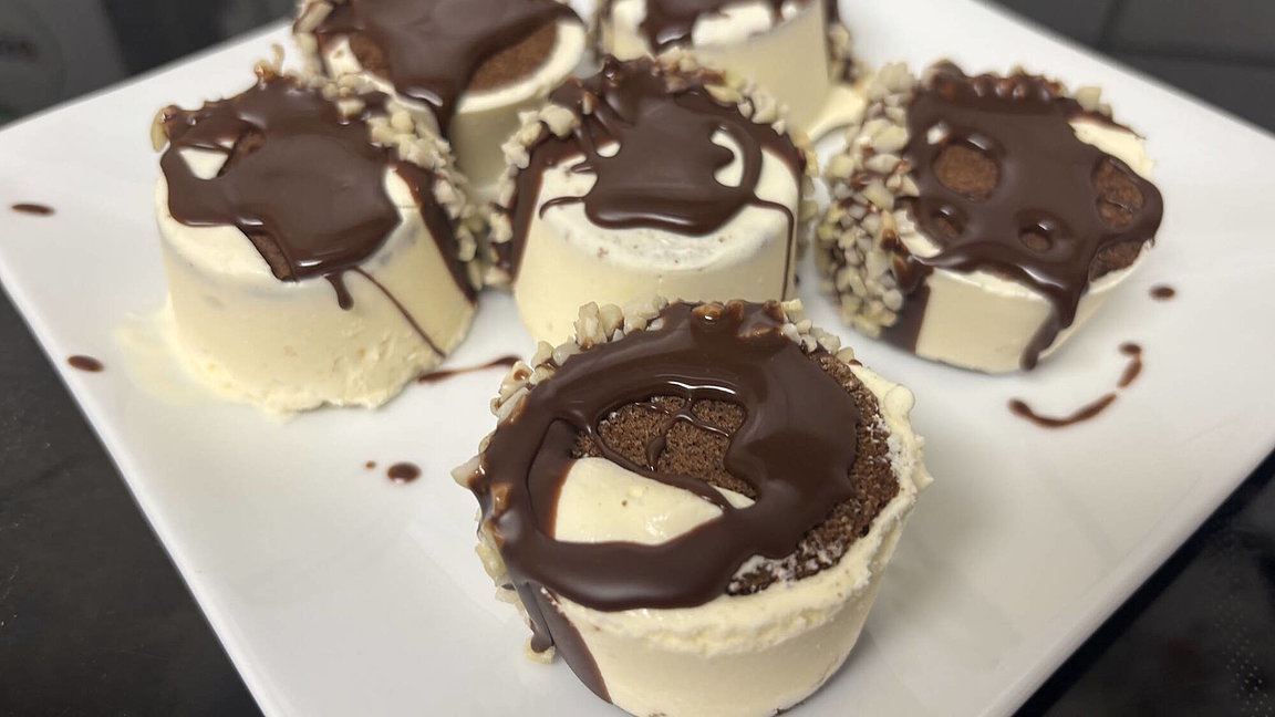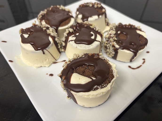 - Die Eissandwiches aus der Form drücken, danach eine Seite in die geschmolzene MCT Cacao Bar tauchen und in die Nüsse drücken.
