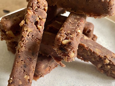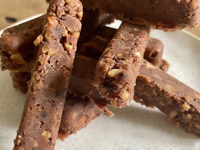 - Die Mischung in eine Silikon-Riegelform drücken und im Kühlschrank fest werden lassen.