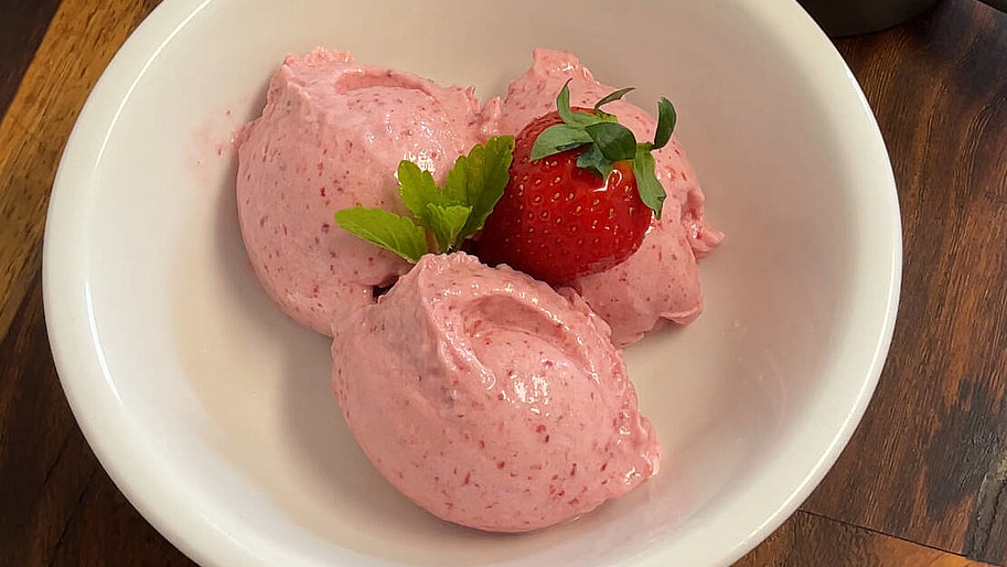 - Gefrorene Erdbeeren mit Erythrit und Limettensaft im Mixer fein hacken.