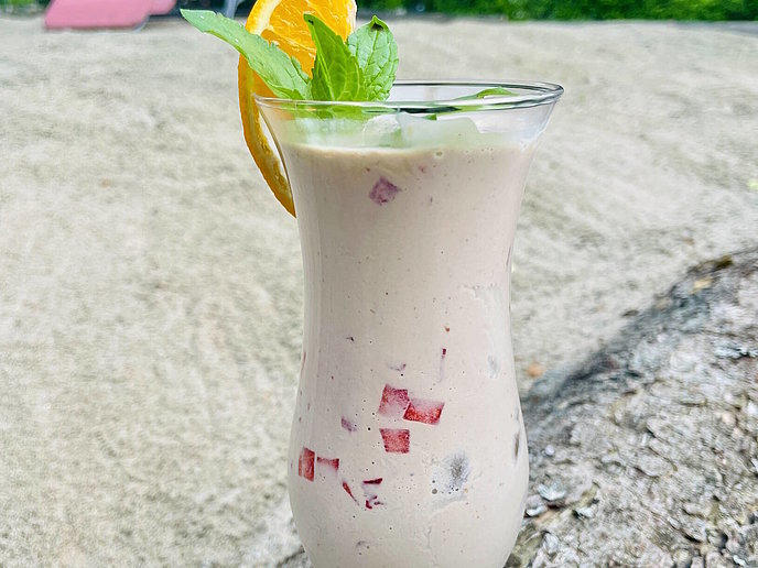 - In ein Glas mit Eis füllen, dekorieren und genießen.