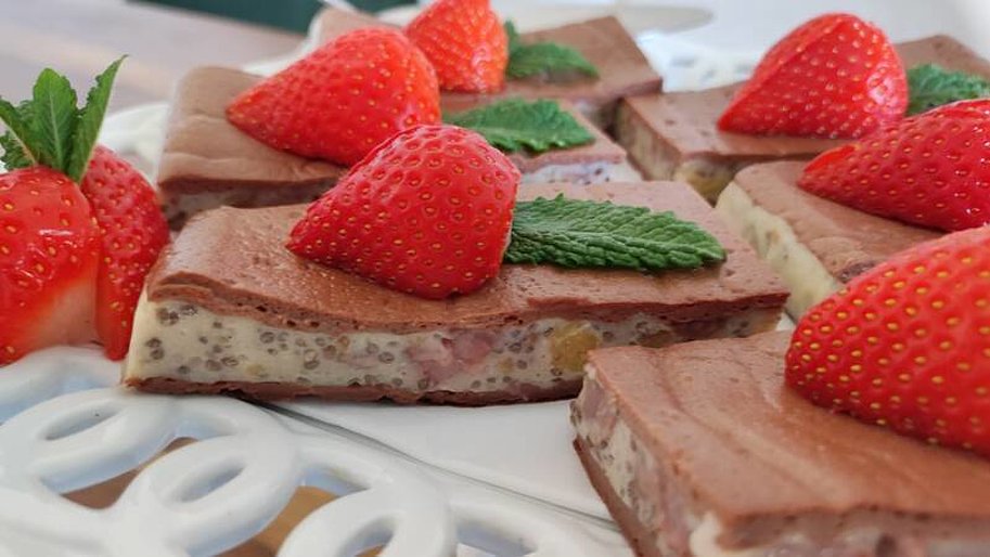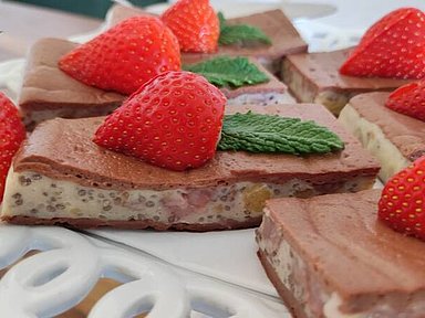 - Für die Füllung 3 Beutel Keto Biota mit 50 ml Wasser und 250 g Speisequark (40% Fett) zu einer cremigen Masse vermischen. Erdbeeren waschen, in kleine Würfel schneiden und zusammen mit den Chiasamen unter die Masse heben.