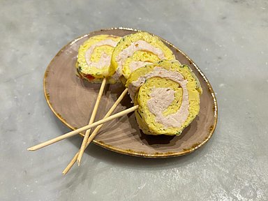 - Die Roulade in Backpapier einwickeln und im Kühlschrank fest werden lassen. Vor dem Servieren in Scheiben schneiden.