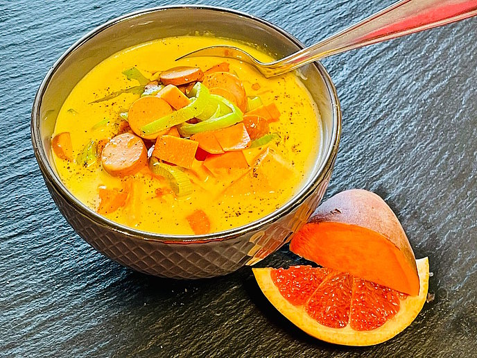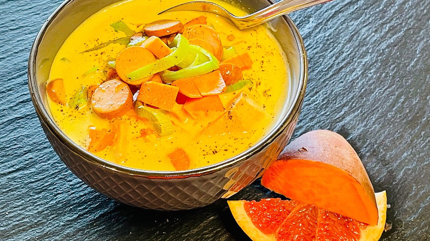 - Einen Teil der Süßkartoffeln zur Seite legen, um diese später als Stückchen mit in die Suppe geben zu können - den Rest pürieren. Danach mit Keto Epi Creamy, MCT Öl 100 % und Sahnealternative aufgießen, die Würstchen hinzugeben und alles erwärmen.