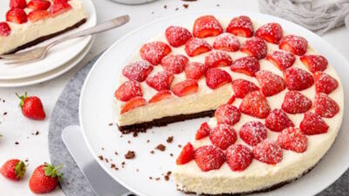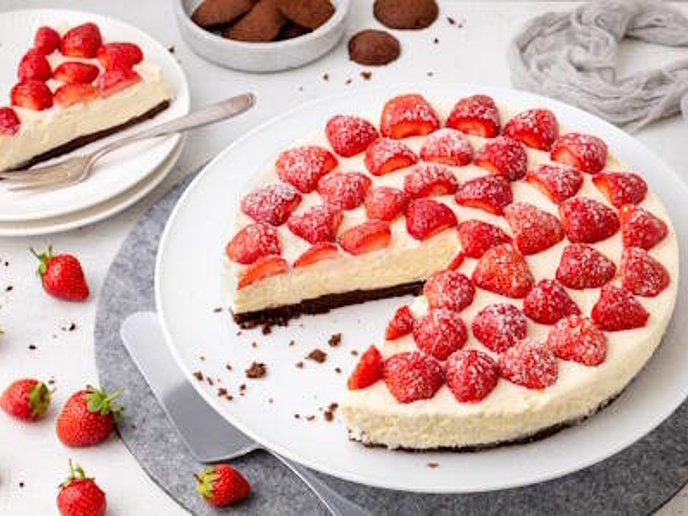 - Vor dem Servieren mit Erdbeeren verzieren.