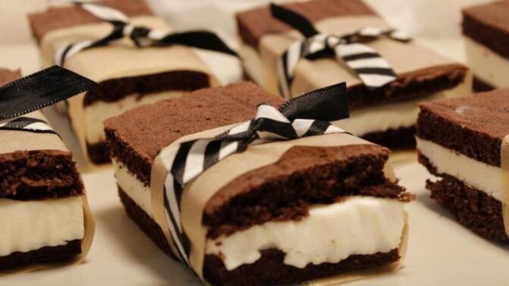 - Die Füllung auf eine Hälfte geben und gleichmäßig verstreichen. Mit der zweiten Biskuithälfte abdecken und für mindestens 2 Stunden in den Kühlschrank stellen. Gekühlt in 10 kleine Schnitten schneiden und genießen.