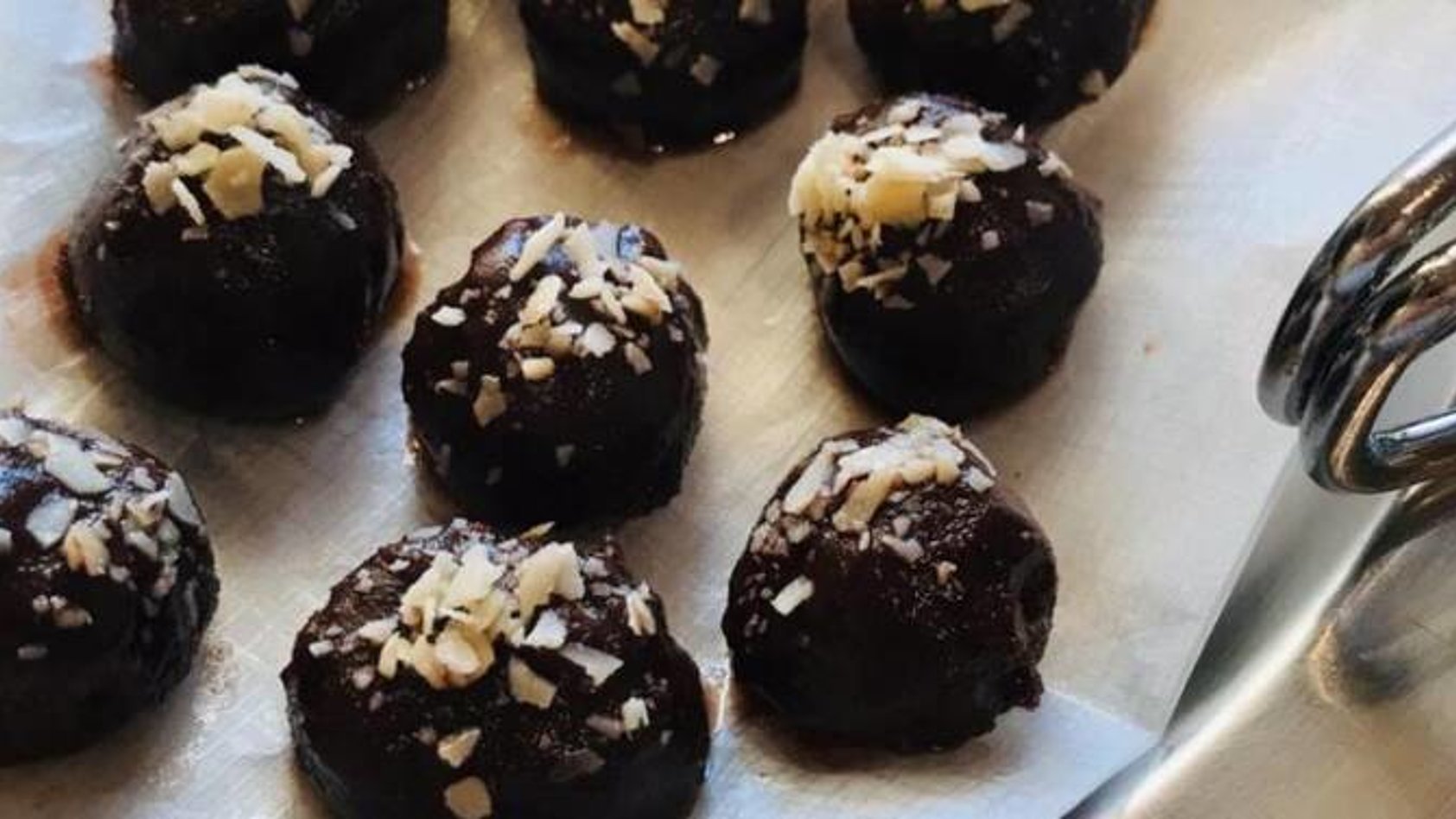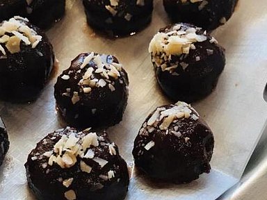 - Zur Dekoration können die Kugeln noch mit einem Hauch zerkleinerter Mandelblättchen oder gemahlenen Mandeln bestreut werden, solange die Schokolade noch nicht fest ist. Anschließend im Kühl-oder Gefrierschrank aufbewahren und kalt oder als „Eiskonfekt“ verzehren