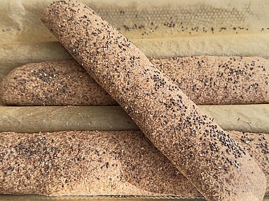 - Für eine knusprige Kruste das Baguette mit etwas Wasser bepinseln und mit Chiasamen bestreuen.