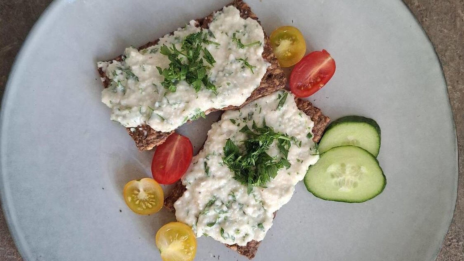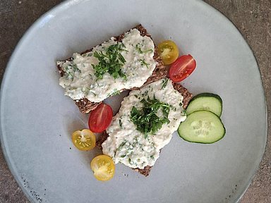 - Eine Scheibe Keto Crispbread in zwei gleichgroße Hälften teilen und mit der Creme bestreichen.