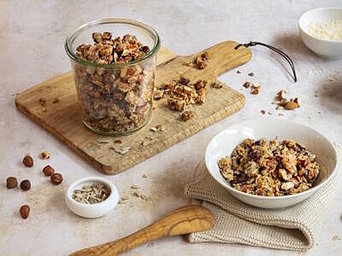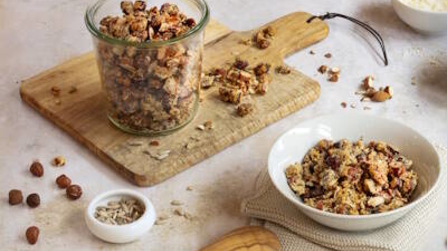 - Kokosraspeln, Chiasamen, Leinsamen, Sonnenblumenkerne und Keto Biota dazugeben und alles vermischen.