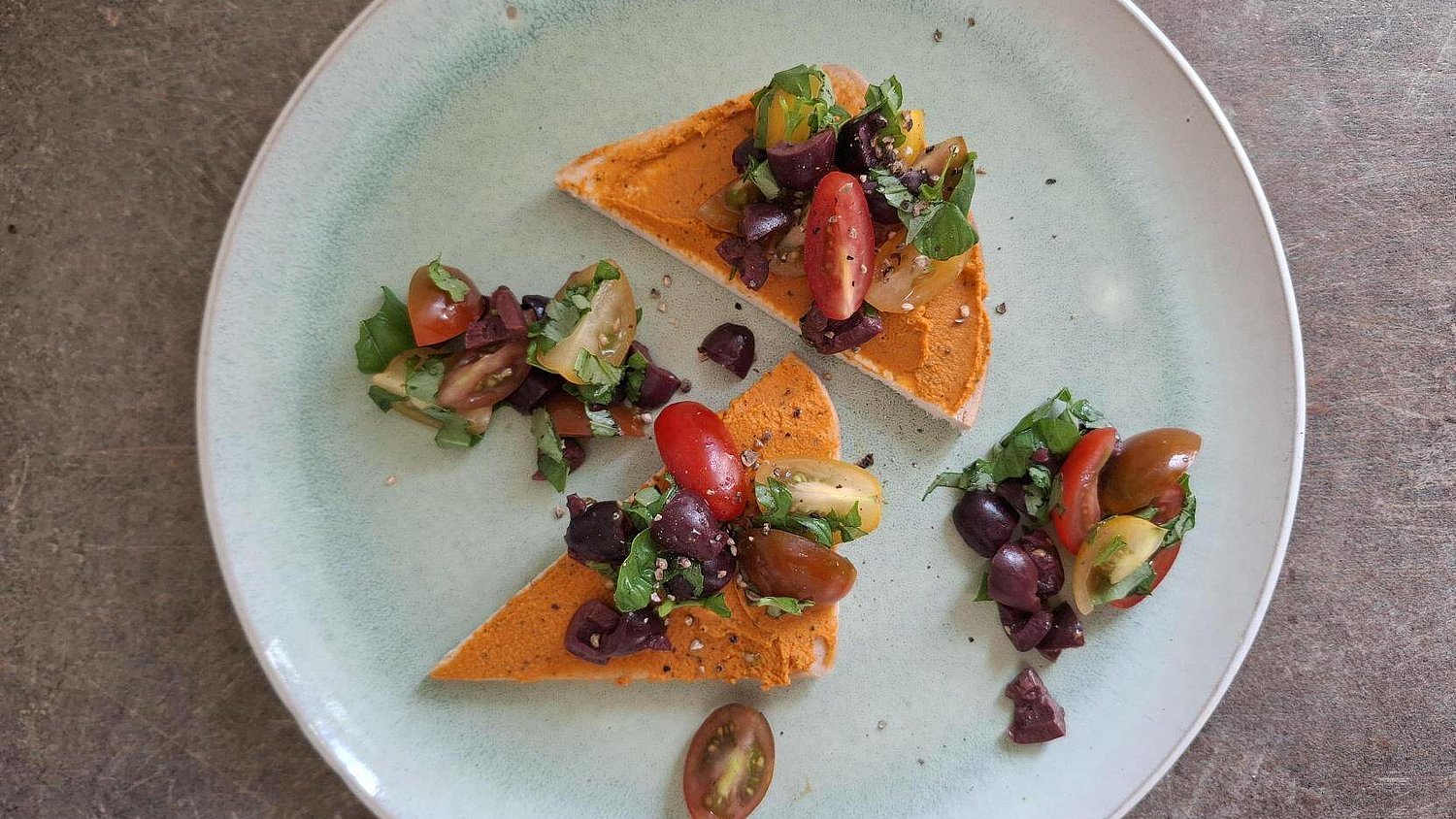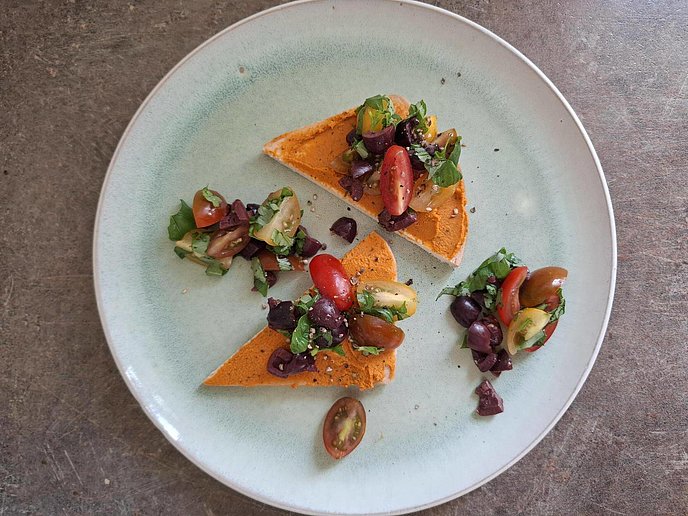- Cocktailtomaten und Kalmata-Oliven klein würfeln, miteinander vermischen, mit Salz, Pfeffer und Basilikum würzen und auf dem Brot drapieren.