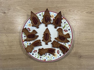 Die Plätzchen mit Pekannüssen dekorieren und für 10 min bei 175°C im Ofen backen. Abkühlen lassen und genießen.
