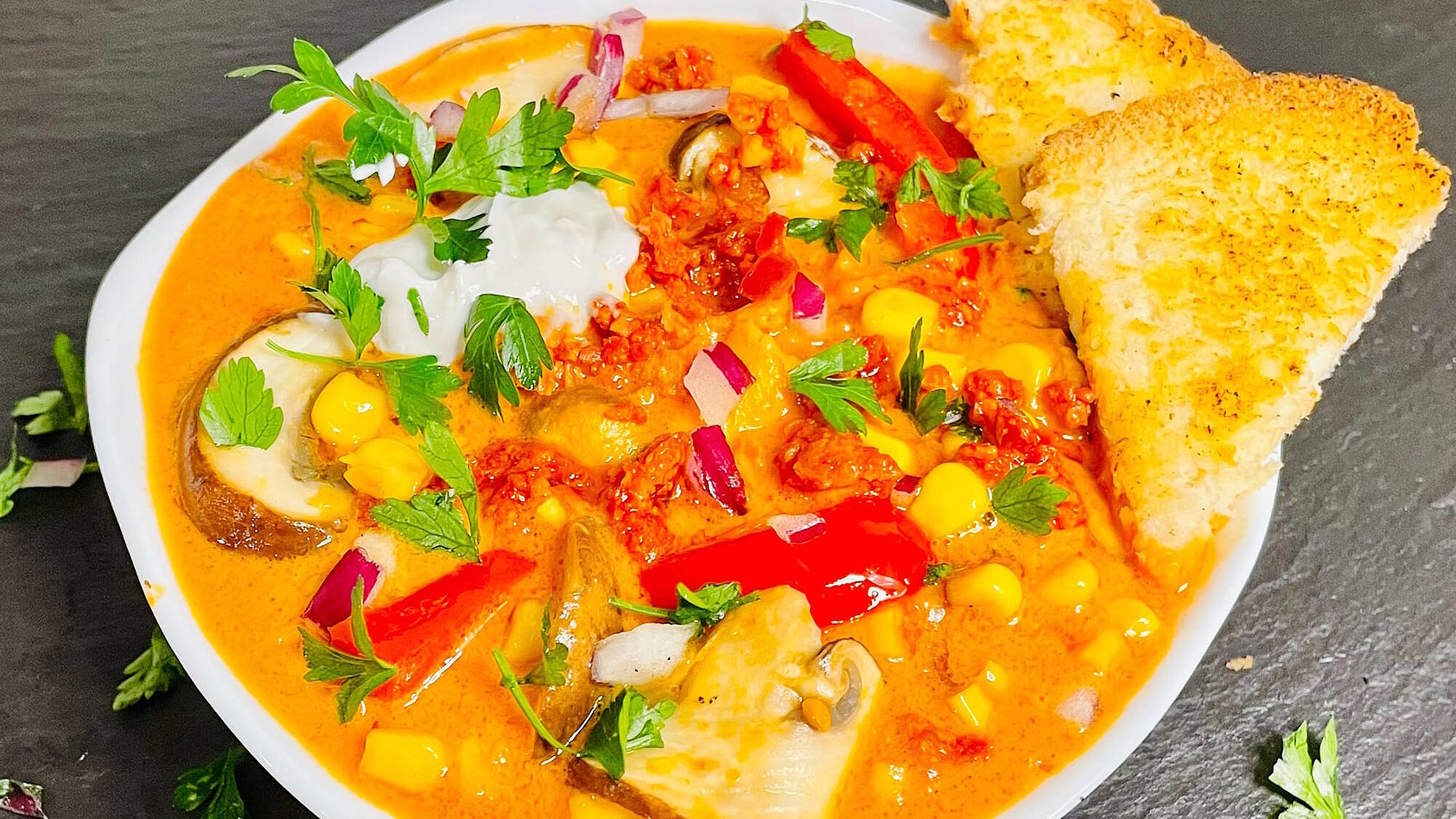 - Anschließend Champignons und Paprika kleinschneiden und zusammen mit dem Mais hinzufügen. Mit den stückigen Tomaten ablöschen und weiter köcheln lassen.