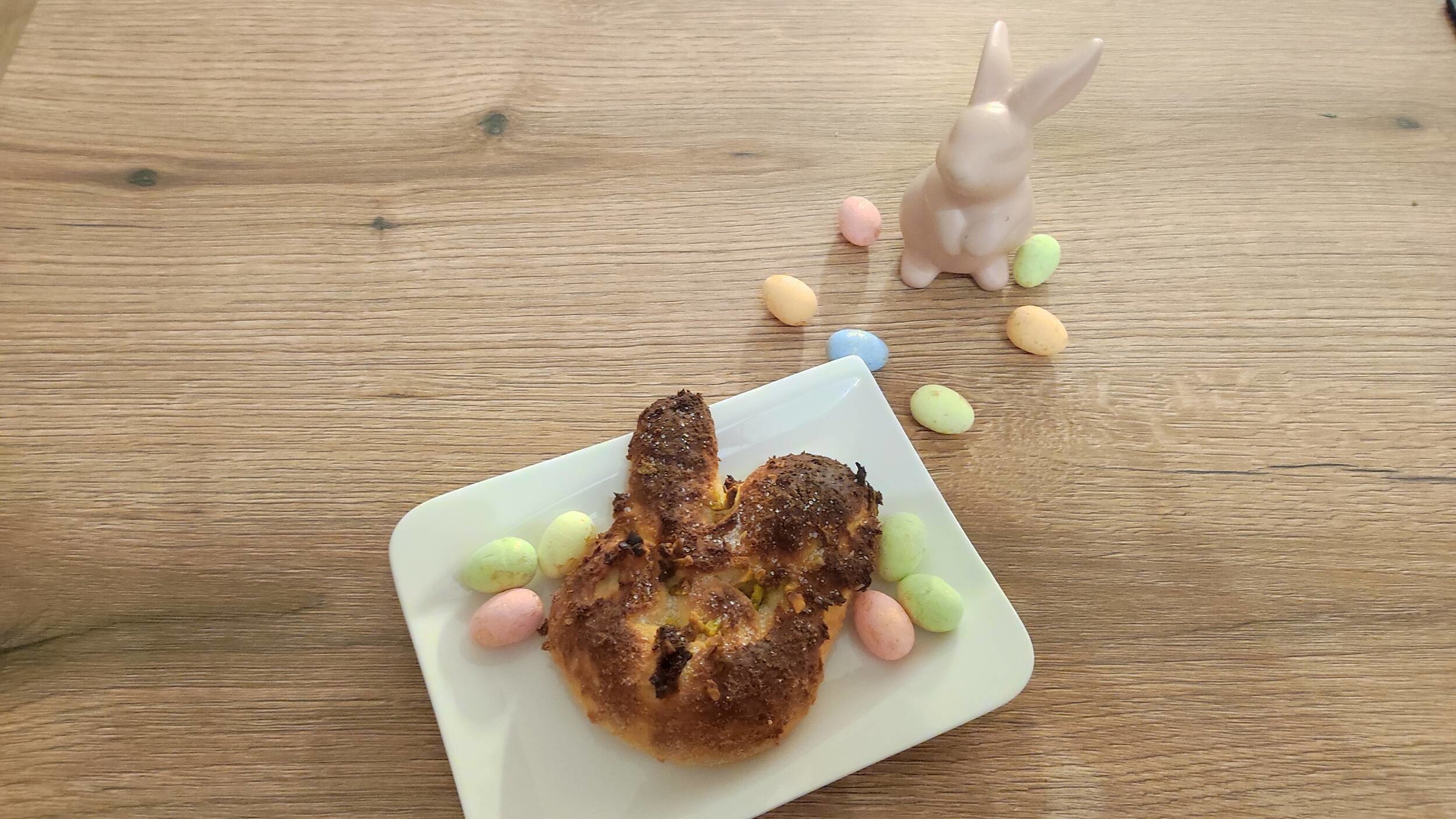 - Den Teig in 8 Kugeln teilen und zu einem Hasenkopf formen und die fertigen Häschen für ca. 30 Minuten bei 160°C im Ofen backen.