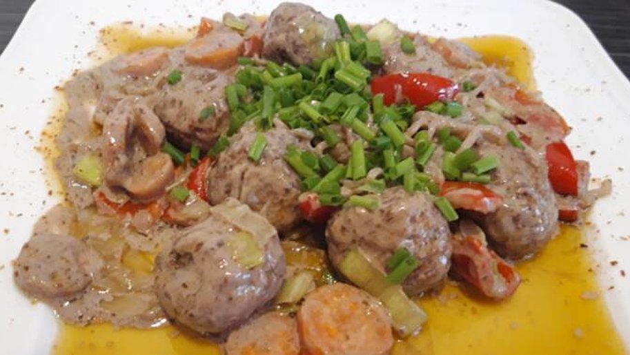 - Vegetarische Klöße und Karotten im Kokosfett anbraten.