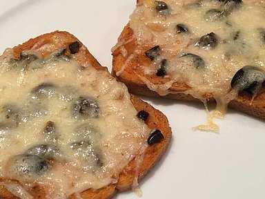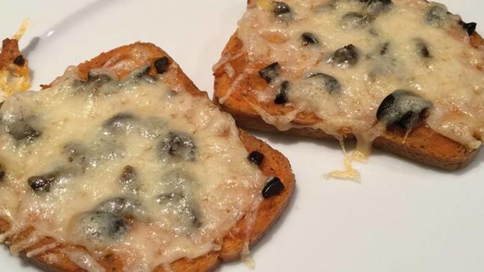 - 2 Scheiben Keto Slices White mit Tomato MCT Cream bestreichen, zuerst mit den Oliven und dann mit dem Käse bestreuen.