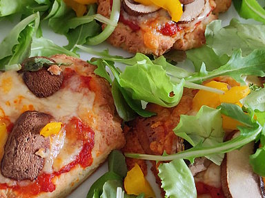 - Die Teigfladen für circa 10 Minuten im vorgeheizten Ofen backen. In der Zwischenzeit das Gemüse wiegen, waschen und klein schneiden.