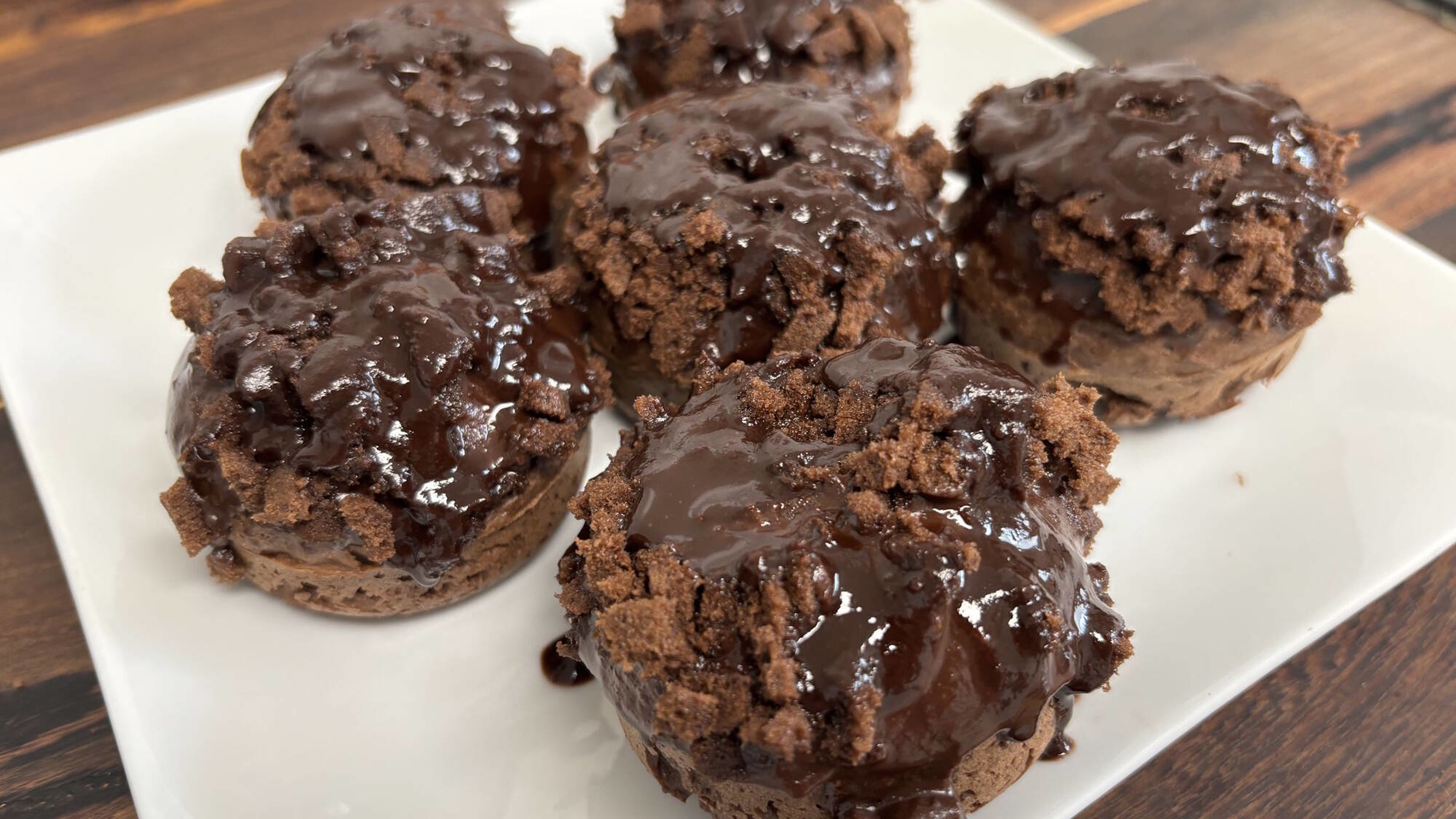 - Donuts in die geschmolzene Schokolade tauchen und mit den zerbröselten Keto Biscuits bestreuen und mit restlicher MCT Cacao Bar beträufeln.