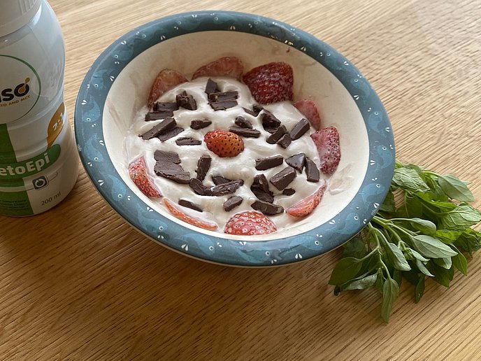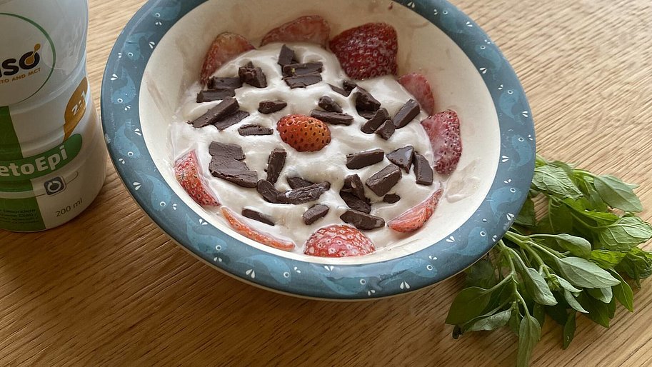 - Mit MCT Cacao Bar-Flocken und frischen Erdbeeren garnieren.