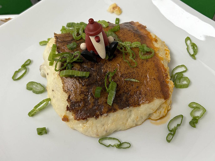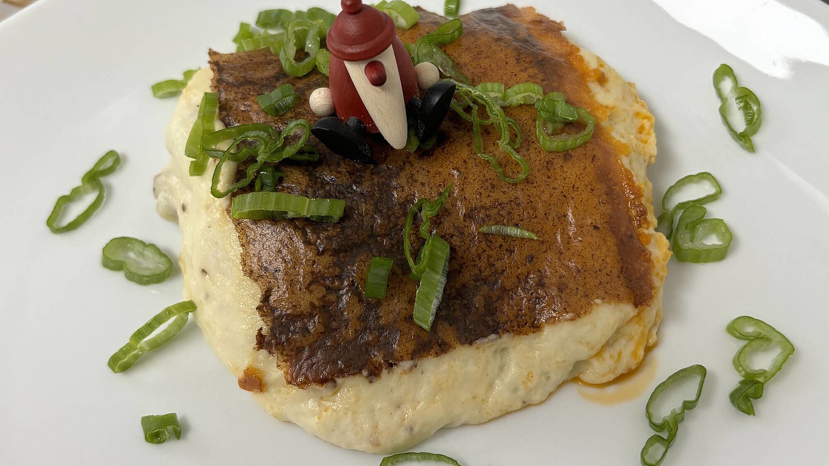 - Die Fleischfüllung in eine Auflaufform geben und das Blumenkohlpüree gleichmäßig darüber verteilen.