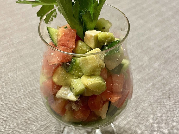 - Gewürfelte Avocado, Gurke und Tomate in eine Schüssel geben.