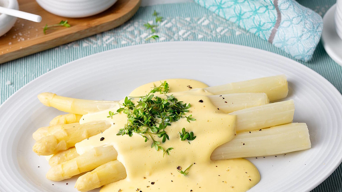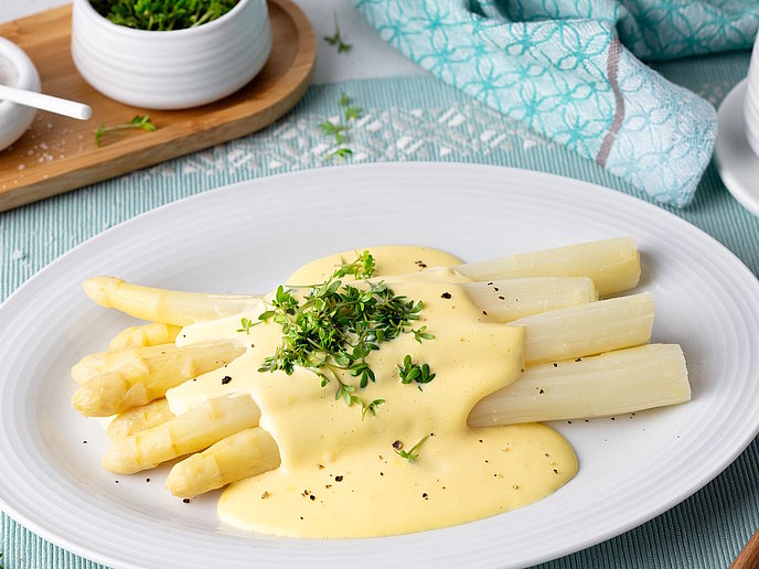 - Spargel mit der warmen Sauce Hollandaise servieren, mit Kresse garnieren.