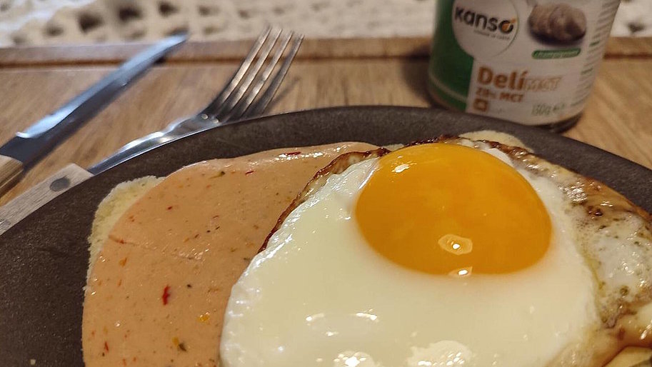- Die vegane Schinkenwurst auf die mit MCT Margarine 83 % bestrichene Brote legen. Das fertig gebratene Ei auf die Wurst geben und direkt servieren. Mit 10 g MCT Cream kombinieren.