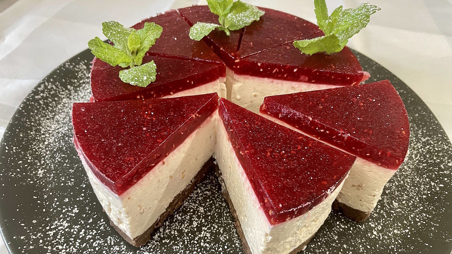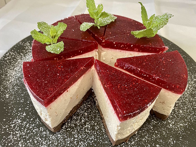 - 2 Blatt Gelatine in kaltem Wasser einweichen und dann unter die Himbeeren geben. Etwas abkühlen lassen und dann auf der Torte verteilen. Für 2-3 Stunden durchkühlen lassen.