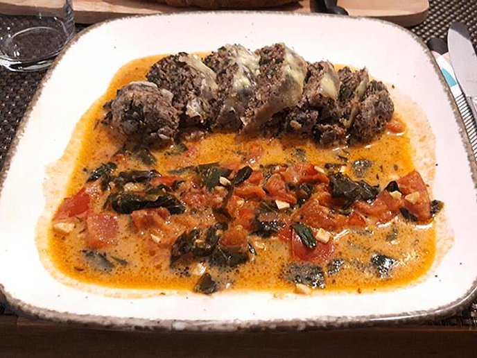 - Etwas Salz, gemahlene Leinsamen, 2 Beutel * MCT Fiber, 15 g Bärlauch, Mandelmehl, Guakernmehl, Mozzarella, geschmolzene MCT Margarine 83 % und 70 ml Mandelmilch in einer Schüssel vermengt.