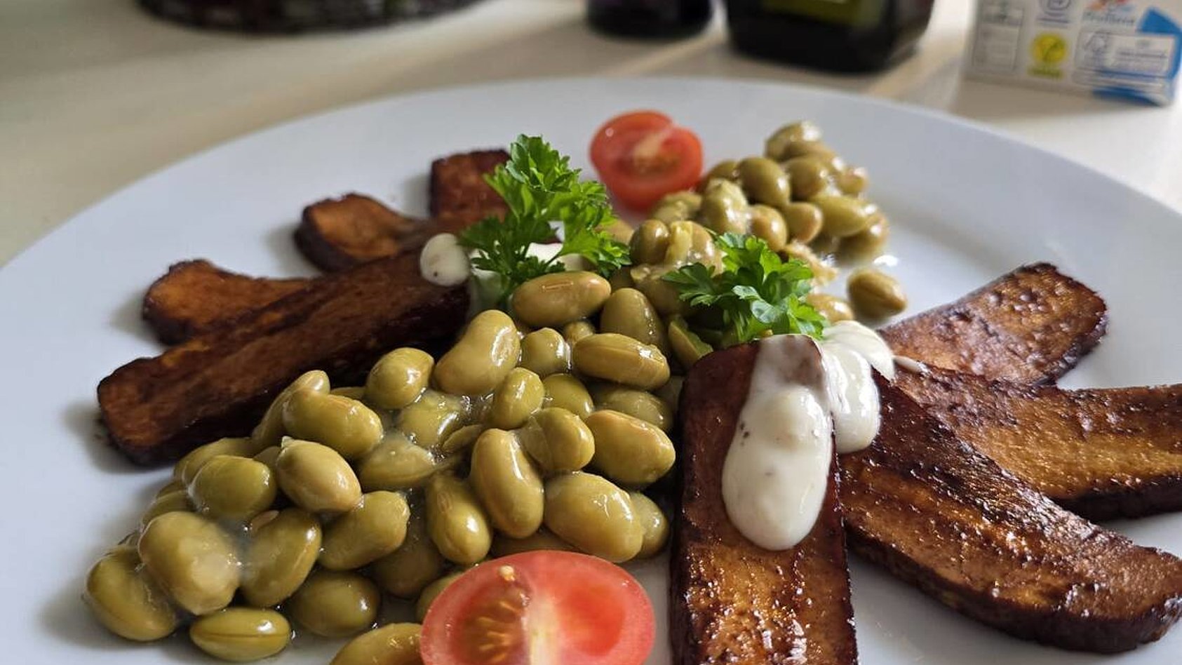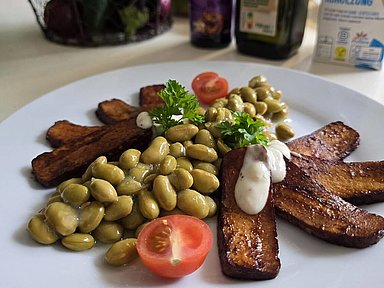 - Tofu mit Edamame und MCT Cream auf einem Teller anrichten.