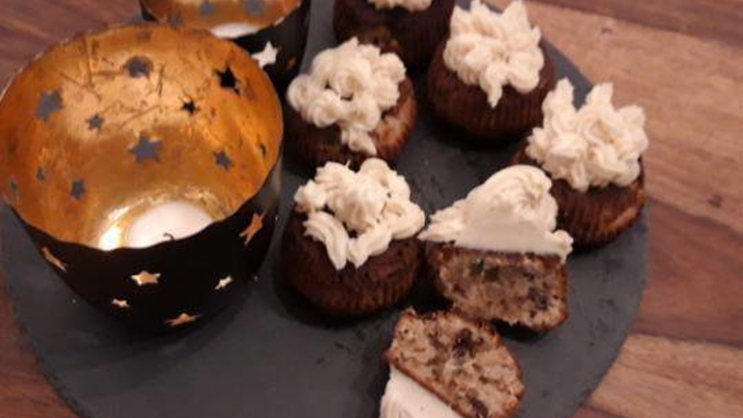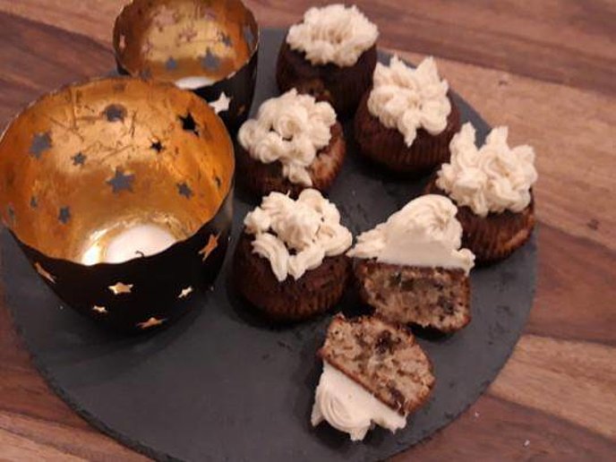 - Abgekühlte Muffins vorsichtig aus den Parpierförmchen lösen und auf die breite Fläche stellen. Die Creme in einen Spritzbeutel mit Sterntülle füllen und die Wipfel spritzen. Bis zum Servieren oder Essen kaltstellen.