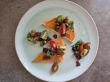 Tagliare una fetta di Keto Slices white diagonalmente in due metà triangolari e tostarla leggermente nel tostapane o nel forno. Spalmare il pane tostato con margarina MCT all’83% e crema MCT al pomodoro. Tagliare a dadini piccoli i pomodorini ciliegia e le olive nere, mescolarli insieme, condire con sale, pepe e basilico, e disporre il tutto sul pane.