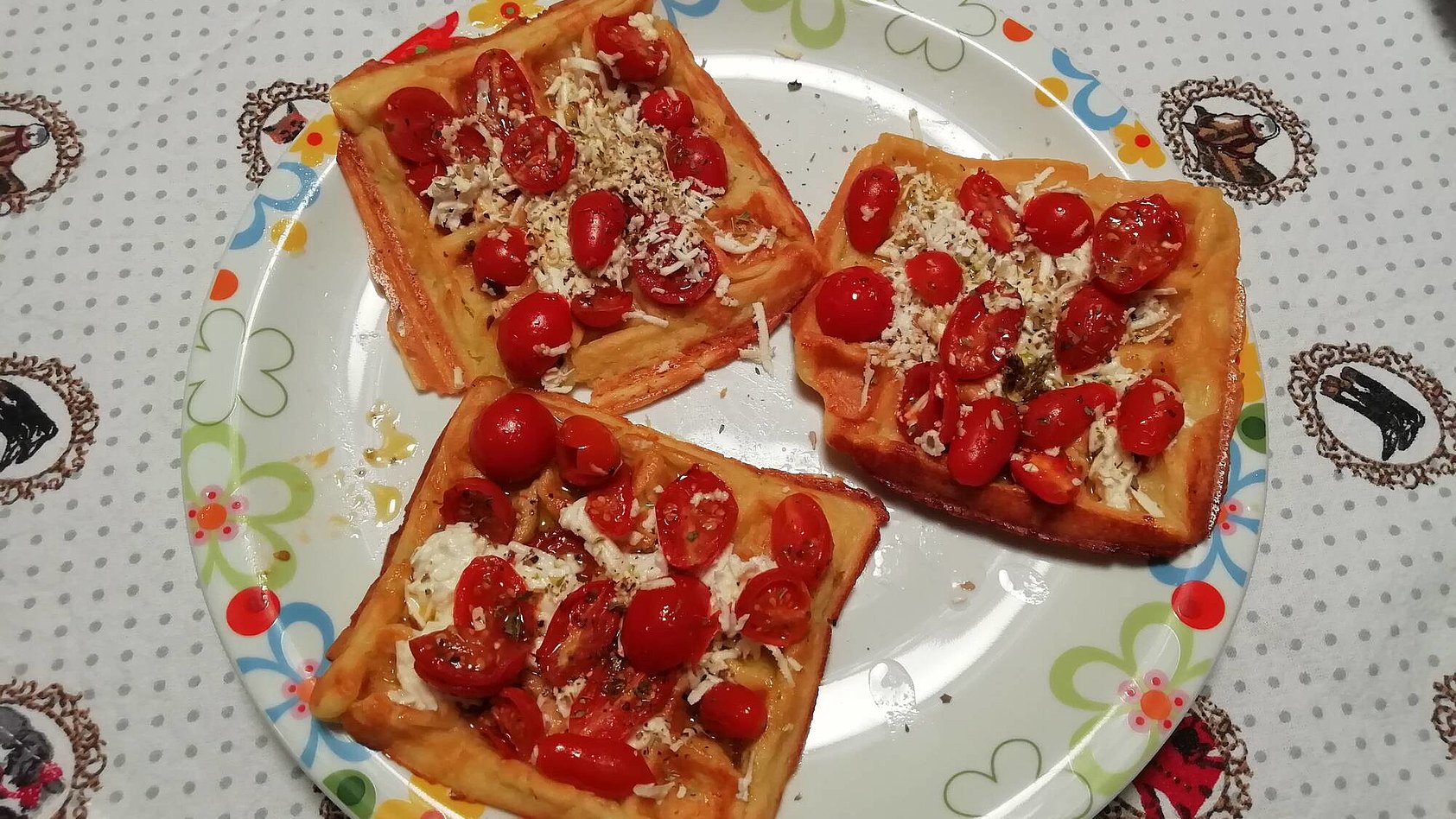 - Mettere nella piastra per waffle. Farcire con feta grattugiata, pomodorini, un filo d'olio EVO e origano.